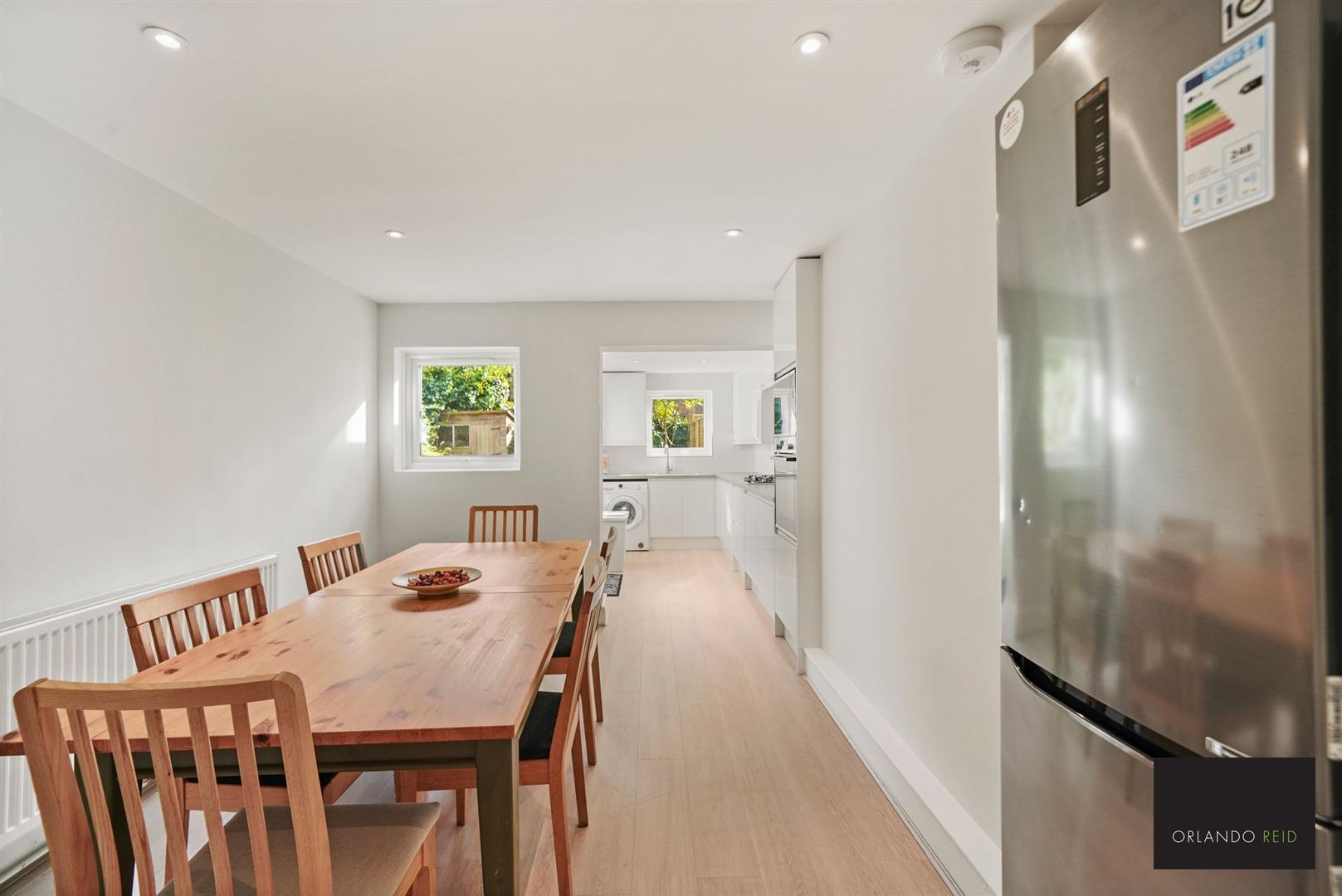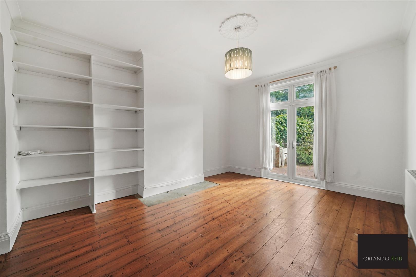 The property boasts a grand dual-aspect reception room, packed full of characterful features including wooden flooring, high ceilings, beautiful cornicing. The room is flooded with natural light from both directions thanks to a wide bay window at the front and double doors to the rear, the latter providing access to the garden. The living space continues through the hallway and into a spacious contemporary dining kitchen.